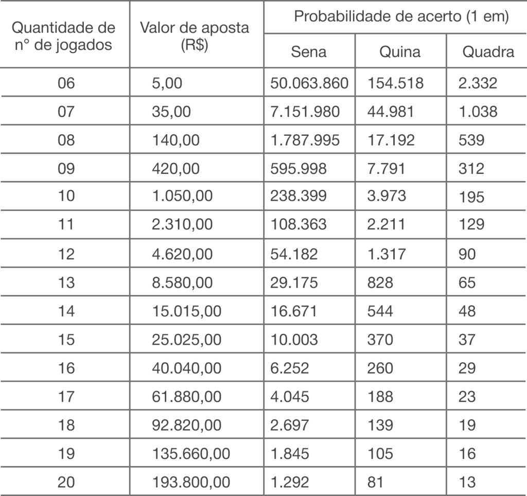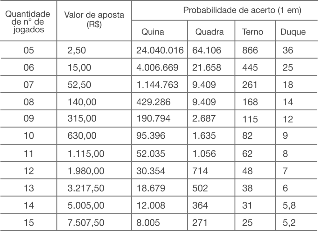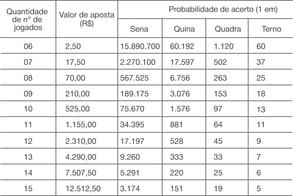 – R$ 25,00 para as apostas com 5 números sorteados.