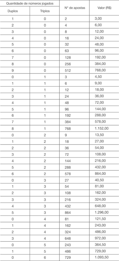 A aposta mínima é de R$ 3,00 e dá direito a um duplo. Quanto mais duplos e triplos marcar, maior é o preço da aposta e maiores são as suas chances de ganhar.