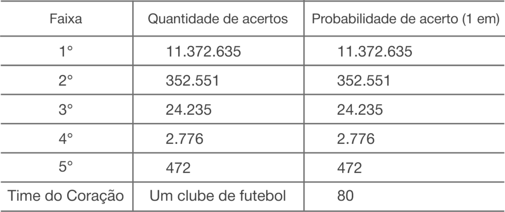 O prêmio bruto corresponde a 43,35% da arrecadação. Dessa porcentagem é deduzido 5% para composição da reserva garantidora de prêmios. Do restante, será deduzido o montante destinado ao pagamento dos prêmios com valores fixos: